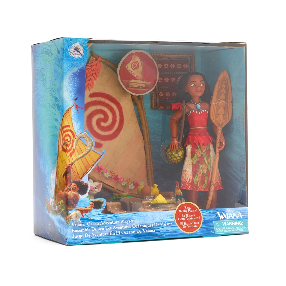 - Contenu : poupée Vaiana, collier, bateau, Hei Hei, Pua, rame, fruit sur une feuille, grappe de fruits, nourriture pour Hei Hei, laitue, panier à couvercle, tasse, gourde et couverture