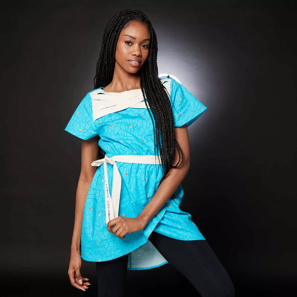 Ajoutez une touche royale à votre garde-robe avec ce haut Black Panther. Ce modèle présente un imprimé intégral discret et un noeud à la taille avec une inscription en wakanda, pour une tenue des plus charmantes.
