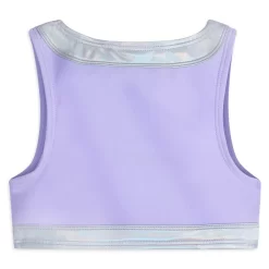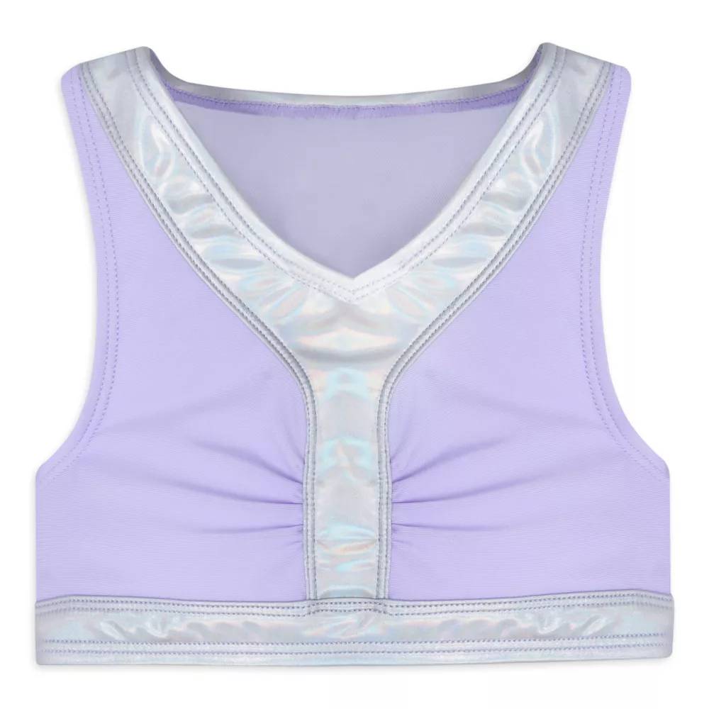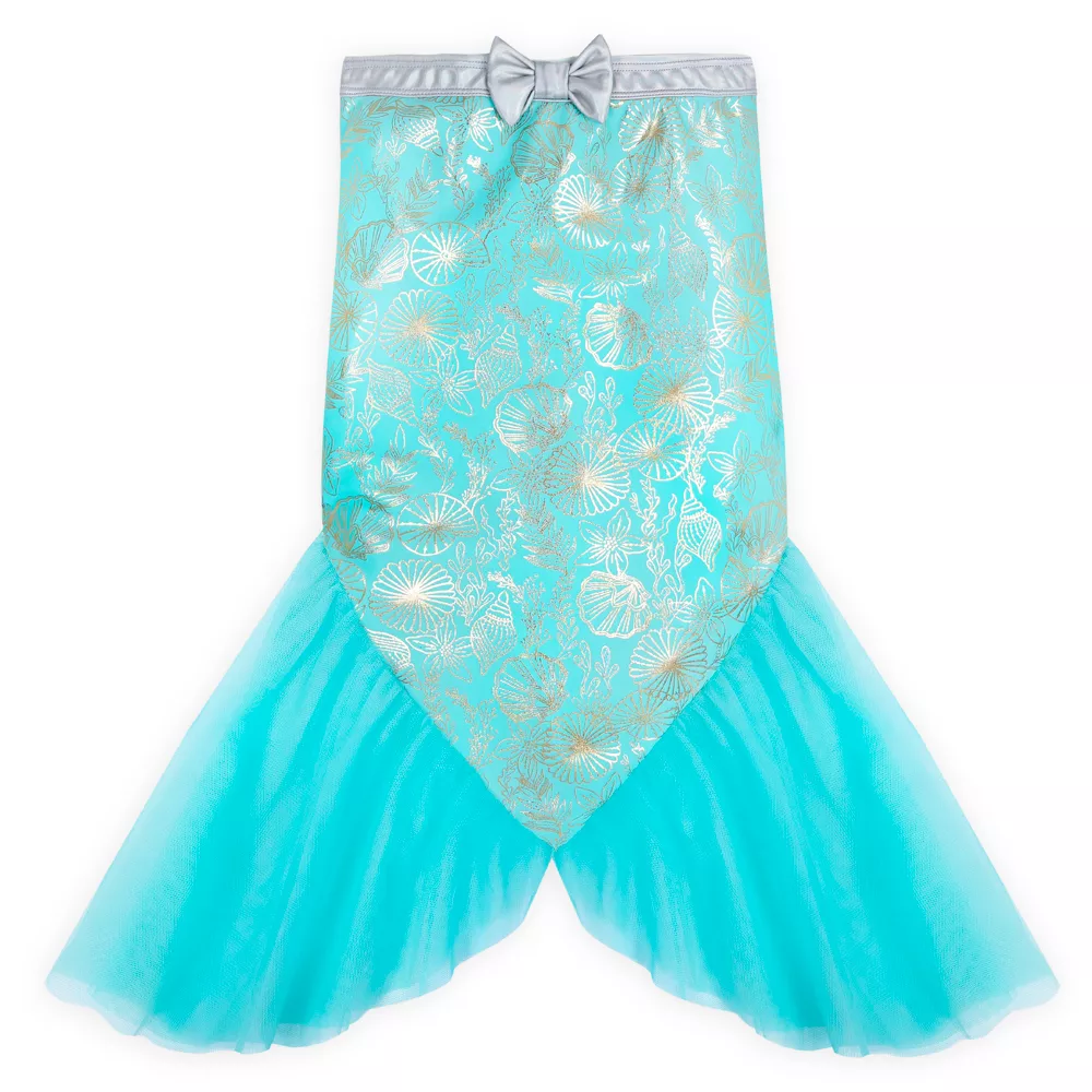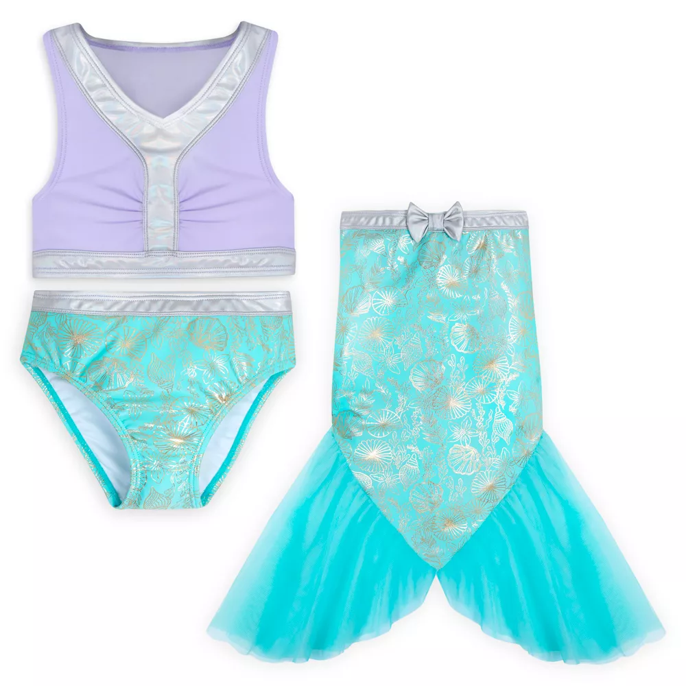 Ariel est peut-être une petite sirène, mais elle a de grands rêves. Ce maillot de bain en fait partie ! Inspiré par La Petite Sirène, ce modèle trois pièces inclut un haut, un bas et une jupe ressemblant à une queue de sirène avec une bordure en organza. Chaque élément a des bordures argentées brillantes, et le bas et la jupe comportent un motif océan intégral.